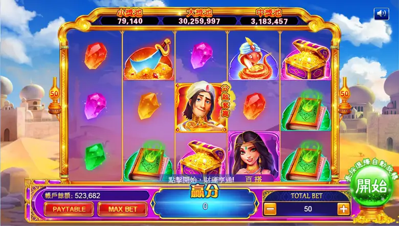 在视觉呈现上,阿拉丁神灯采用了浓厚的中东幻想风格。背景多为夜色下的沙漠王城、金色穹顶与繁星点点的天空,整体色调以金色、深蓝与宝石色为主,既展现华丽感,又保持画面平衡。