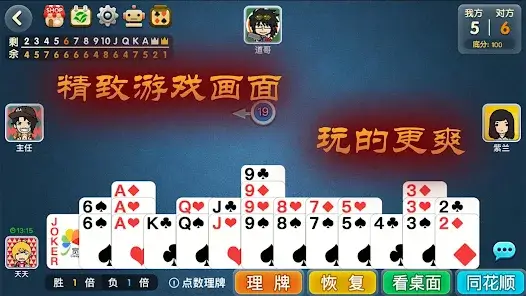 游戏以两副牌为基础,四人分组对战,每一次出招都影响队友与整体局势,因此策略安排尤为关键。